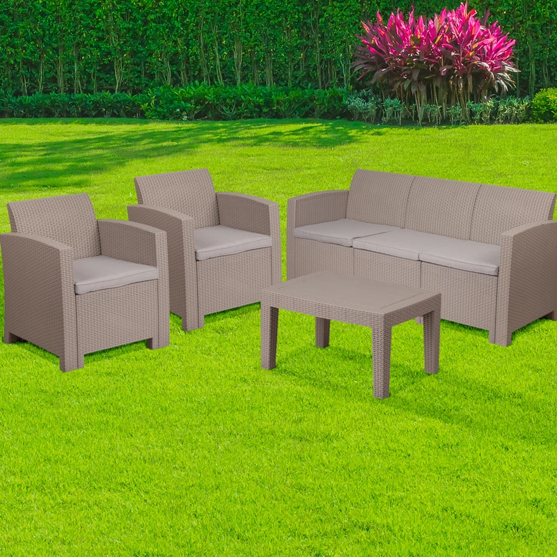 Accommodate all gatherings with this beautiful outdoor seating set. The durable resin frame offers a stylish appearance which replicates rattan. Deep seating enhances the comfort level. All-weather cushions will hold up all season long. The cushions are zipper removable for washing purposes. The table features a plank design with rattan border.