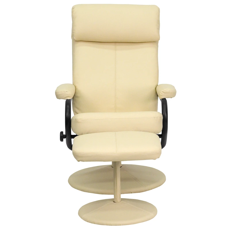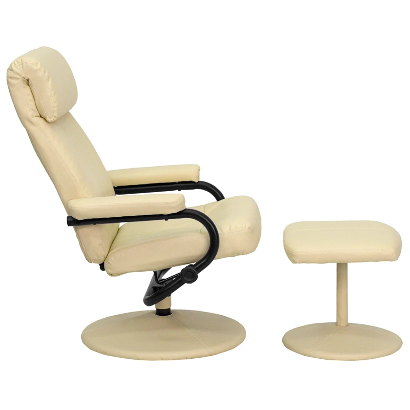 Recline in your favorite position with this comfortable recliner and ottoman set. This set features a built-in pillow top headrest, thickly padded arms and leather wrapped bases. This set is not only perfect in the home, but makes for a great addition in the office when you need to relax for a bit. The durable leather upholstery allows for easy cleaning and regular care.