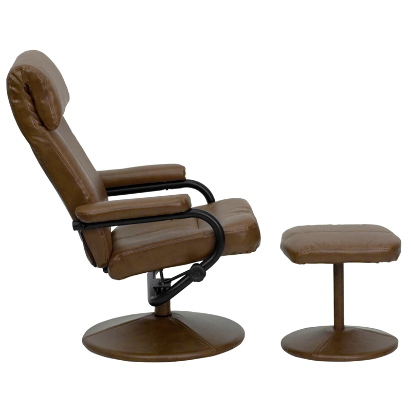 Recline in your favorite position with this comfortable recliner and ottoman set. This set features a built-in pillow top headrest, thickly padded arms and leather wrapped bases. This set is not only perfect in the home, but makes for a great addition in the office when you need to relax for a bit. The durable leather upholstery allows for easy cleaning and regular care.