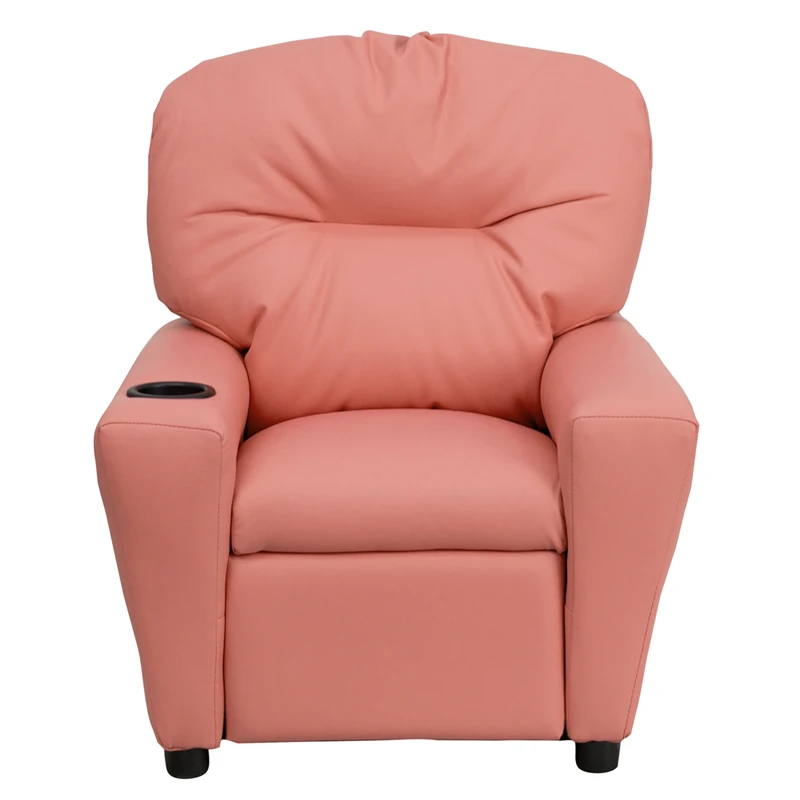 The child-sized recliner with plush padding is a perfect spot for kids to watch TV, play video games or read their favorite book.The chair features a built in cup holder to free up busy hands and prevent spills. This sturdy little recliner has a solid hardwood frame, soft foam padding and durable vinyl upholstery that cleans easily with a damp cloth. It has raised black plastic feet and will hold up to 90 pounds. Designed with safety in mind, it’s filled with CA117 fire retardant foam, and reclines only when a child is seated and the footrest is pulled out one inch.This cozy kids recliner will be a great addition to your living room or your child’s bedroom or playroom.