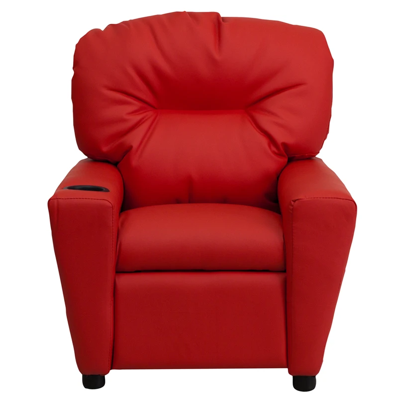 The child-sized recliner with plush padding is a perfect spot for kids to watch TV, play video games or read their favorite book.The chair features a built in cup holder to free up busy hands and prevent spills. This sturdy little recliner has a solid hardwood frame, soft foam padding and durable vinyl upholstery that cleans easily with a damp cloth. It has raised black plastic feet and will hold up to 90 pounds. Designed with safety in mind, it’s filled with CA117 fire retardant foam, and reclines only when a child is seated and the footrest is pulled out one inch.This cozy kids recliner will be a great addition to your living room or your child’s bedroom or playroom.