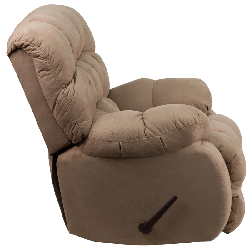 This plush microfiber recliner provides comforting seating with a heavily padded back and arms. Reclining furniture offers the best in relaxation for you to kick up your feet to watch TV, work on a laptop, or to just hang out with family and friends. With a quick pull on the lever you can situate yourself in a comfortable position. Use as a traditional recliner or a soothing rocker that can aide in sleeping and with nursing mothers. Get cozy and relax in this plush designed recliner.