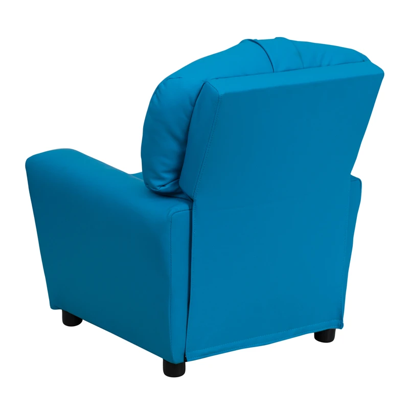 The child-sized recliner with plush padding is a perfect spot for kids to watch TV, play video games or read their favorite book.The chair features a built in cup holder to free up busy hands and prevent spills. This sturdy little recliner has a solid hardwood frame, soft foam padding and durable vinyl upholstery that cleans easily with a damp cloth. It has raised black plastic feet and will hold up to 90 pounds. Designed with safety in mind, it’s filled with CA117 fire retardant foam, and reclines only when a child is seated and the footrest is pulled out one inch.This cozy kids recliner will be a great addition to your living room or your child’s bedroom or playroom.