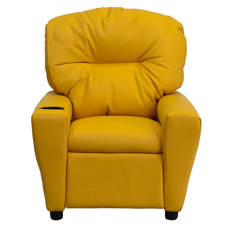 The child-sized recliner with plush padding is a perfect spot for kids to watch TV, play video games or read their favorite book.The chair features a built in cup holder to free up busy hands and prevent spills. This sturdy little recliner has a solid hardwood frame, soft foam padding and durable vinyl upholstery that cleans easily with a damp cloth. It has raised black plastic feet and will hold up to 90 pounds. Designed with safety in mind, it’s filled with CA117 fire retardant foam, and reclines only when a child is seated and the footrest is pulled out one inch.This cozy kids recliner will be a great addition to your living room or your child’s bedroom or playroom.