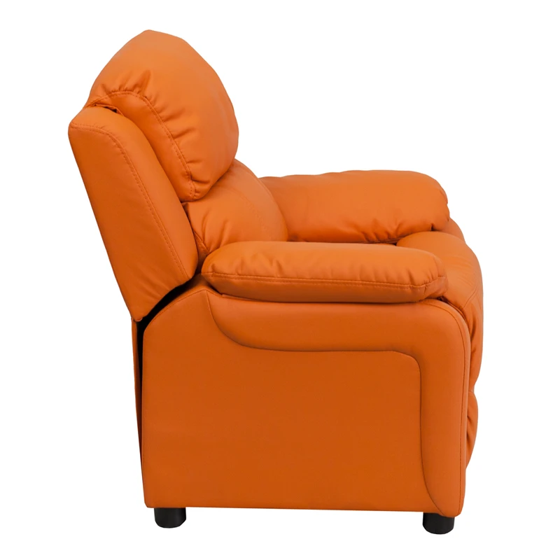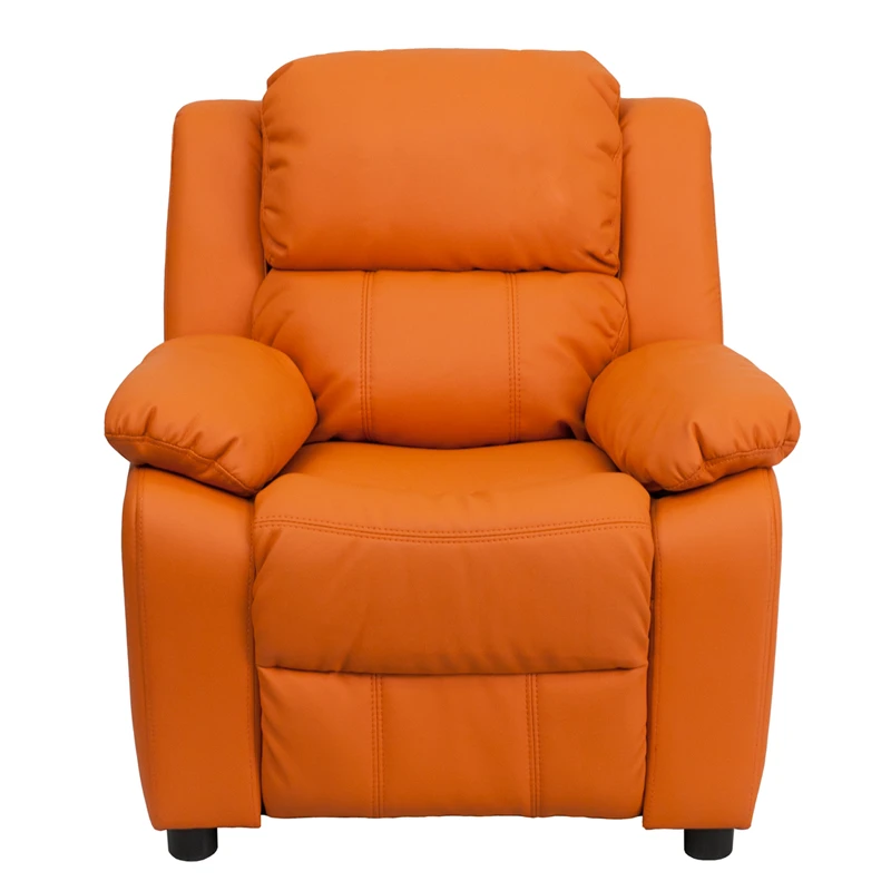 The child-sized recliner with deluxe padding is a perfect spot for kids to watch TV, play video games or read their favorite book.The chair features plush padding, vinyl upholstery and flip-up storage arms for remote controls, books and game controllers. This sturdy little recliner has a solid hardwood frame and durable upholstery that cleans easily with a damp cloth. It has raised black plastic feet and will hold up to 90 pounds. Designed with safety in mind, it’s filled with CA117 Fire retardant foam, and reclines only when a child is seated and the footrest is pulled out one inch.This cozy kids recliner will be a great addition to your living room or your child’s bedroom or playroom.