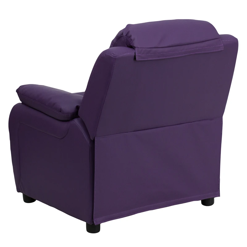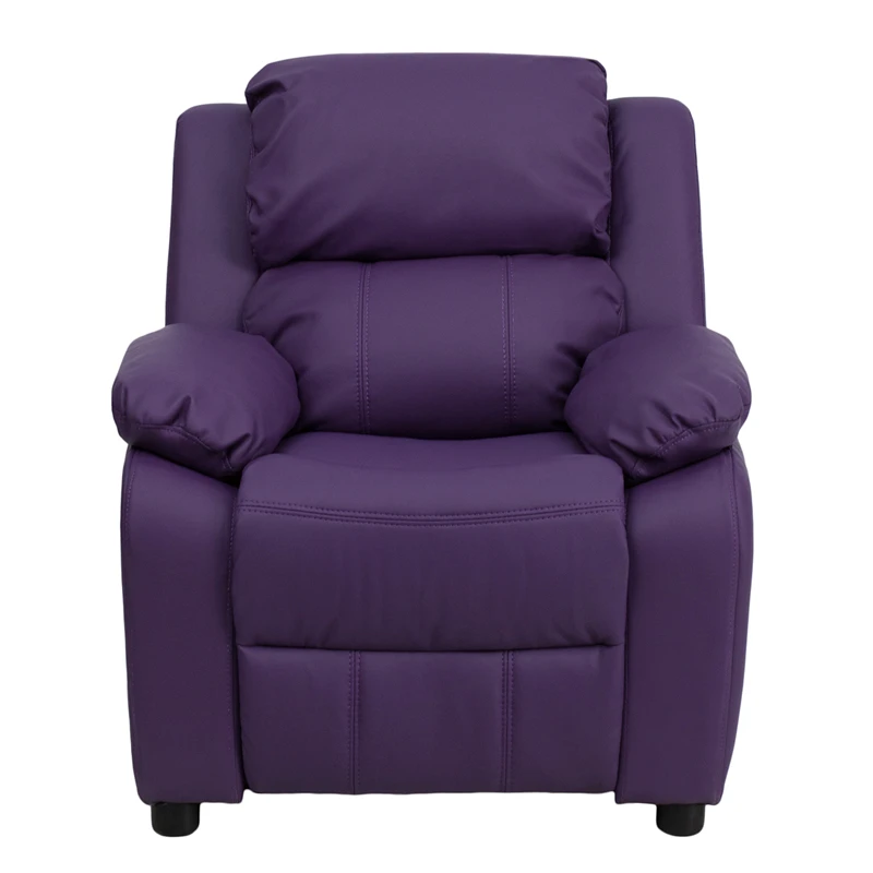 The child-sized recliner with deluxe padding is a perfect spot for kids to watch TV, play video games or read their favorite book.The chair features plush padding, vinyl upholstery and flip-up storage arms for remote controls, books and game controllers. This sturdy little recliner has a solid hardwood frame and durable upholstery that cleans easily with a damp cloth. It has raised black plastic feet and will hold up to 90 pounds. Designed with safety in mind, it’s filled with CA117 Fire retardant foam, and reclines only when a child is seated and the footrest is pulled out one inch.This cozy kids recliner will be a great addition to your living room or your child’s bedroom or playroom.