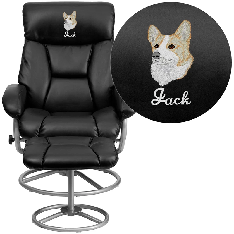 This overstuffed leather recliner will look great in any room in the home or office. This set features plush padding throughout the chair and ottoman as well as exposed metal bases. The durable leather upholstery allows for easy cleaning and regular care. Personalize this chair with custom text or a logo to show off your individual style or company design.