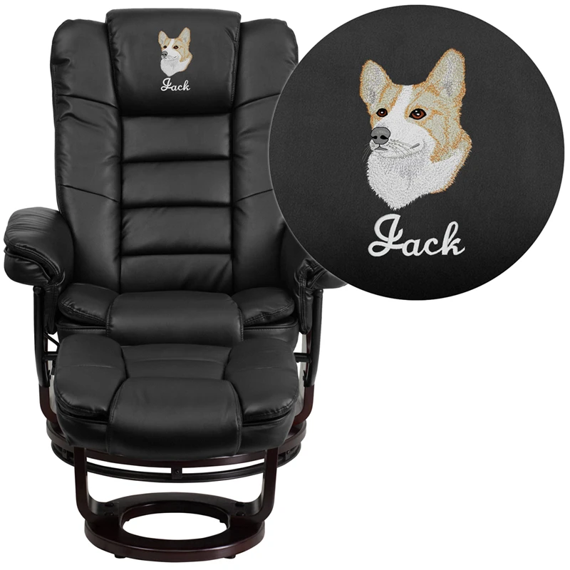 There’s no better way to enjoy a movie, a book or just some down time than in a recliner. This set features thickly padded arms and tastefully exposed wood frames. This uniquely designed recliner features a ball-bearing swiveling base that makes swiveling effortless. This set is not only perfect in the home, but makes for a great addition in the office. The durable leather upholstery allows for easy cleaning and regular care. Personalize this chair with custom text or a logo to show off your individual style or company design.