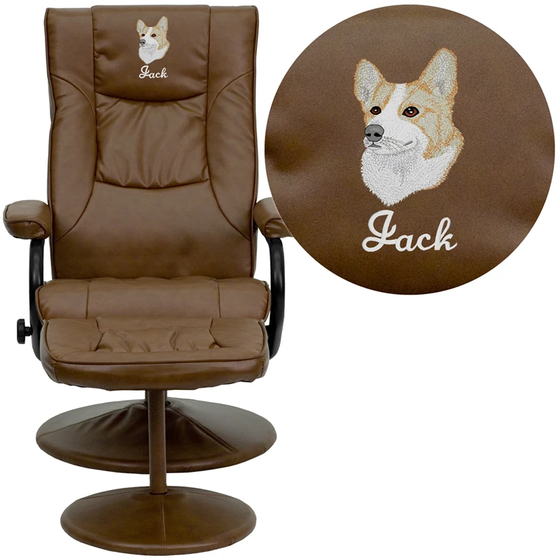 The Leather Recliner and Ottoman with Leather Wrapped Base gives you a great excuse to kick back and relax.Ease into this luxurious chair with its padded seat and back, integrated headrest and plush upholstered arms. A knob, conveniently located under the right arm, brings the chair to a full reclining position. The recliner features CA 117 fire retardant padding in the back, seat and armrests, upholstered in leather with a leather wrapped base. A matching ottoman completes the set.This contemporary recliner with matching ottoman is a comfortable place to spend a little quality time. Personalize it with a name, logo or company name embroidered on the chair’s back. Select a design from our Digital Library (20,000 Images) or submit your own custom design. Choose from many available fonts and thread colors.