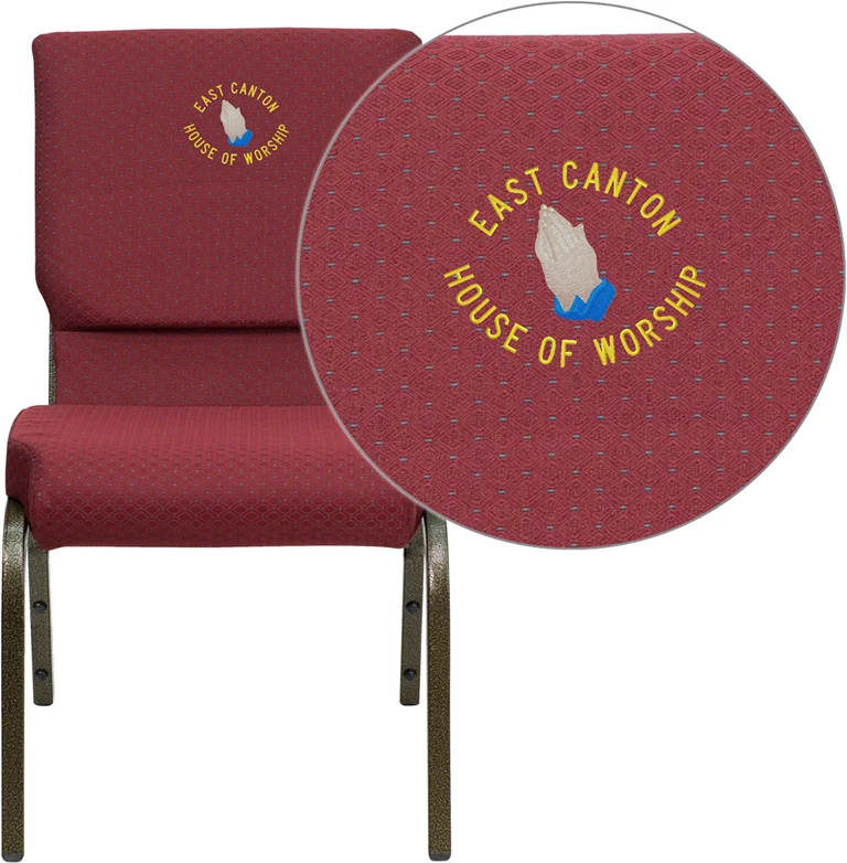 This beautiful church chair will keep your guests comfortable whether you’re hosting an all-day seminar, serving a 10 course meal or delivering your most inspirational sermon. This chair offers an advantage over pew seating with the flexibility of creating different seating configurations.The chair’s cushioned back and 4 inch thick seat are generously padded with CA117 fire retardant foam and covered in durable fabric upholstery. The seat has a waterfall edge that reduces pressure on your attendees’ legs. A convenient book pouch on the back of the chair keeps seminar materials, bibles or hymn books readily available. Built-in ganging brackets connect your chairs and maintain nice, straight rows. Its sturdy 16 gauge steel, gold vein frame, with gracefully angled legs, has been tested to hold up to 800 pounds and plastic rocker glides protect your floor by sliding smoothly when you need to move the chair. Personalize it with a name, logo or organization name embroidered on the chair’s back. Select a design from our Digital Library (20,000 Images) or submit your own custom design. Choose from many available fonts and thread colors.This Church Chair is an excellent option for hotel lobbies, banquet halls, conference facilities and worship centers.
