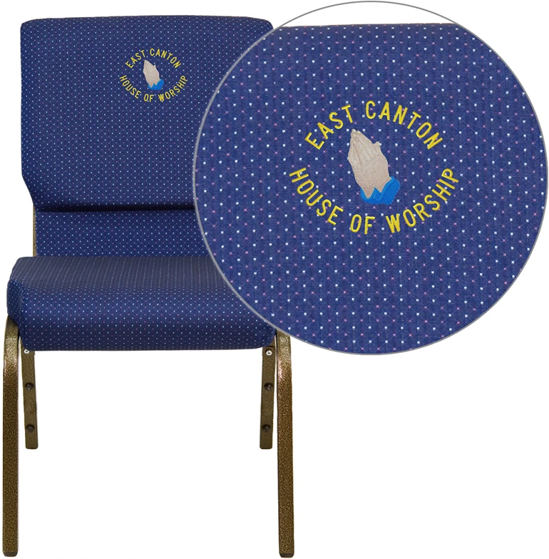 This beautiful church chair will keep your guests comfortable whether you’re hosting an all-day seminar, serving a 10 course meal or delivering your most inspirational sermon. This chair offers an advantage over pew seating with the flexibility of creating different seating configurations.The chair’s cushioned back and 4 inch thick seat are generously padded with CA117 fire retardant foam and covered in durable fabric upholstery. The seat has a waterfall edge that reduces pressure on your attendees’ legs. A convenient book pouch on the back of the chair keeps seminar materials, bibles or hymn books readily available. Built-in ganging brackets connect your chairs and maintain nice, straight rows. Its sturdy 16 gauge steel, gold vein frame, with gracefully angled legs, has been tested to hold up to 800 pounds and plastic rocker glides protect your floor by sliding smoothly when you need to move the chair. Personalize it with a name, logo or organization name embroidered on the chair’s back. Select a design from our Digital Library (20,000 Images) or submit your own custom design. Choose from many available fonts and thread colors.This Church Chair is an excellent option for hotel lobbies, banquet halls, conference facilities and worship centers.