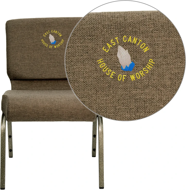 This beautiful church chair will keep your guests comfortable whether you’re hosting an all-day seminar, serving a 10 course meal or delivering your most inspirational sermon. This chair offers an advantage over pew seating with the flexibility of creating different seating configurations.The chair’s cushioned back and 4 inch thick seat are generously padded with CA117 fire retardant foam and covered in durable fabric upholstery. The spacious, 21 inch wide seat has a waterfall edge that reduces pressure on your attendees’ legs. A convenient book pouch on the back of the chair keeps seminar materials, bibles or hymn books readily available. Built-in ganging brackets connect your chairs and maintain nice, straight rows. Its sturdy 16 gauge steel, gold vein frame, with gracefully angled legs, has been tested to hold up to 800 pounds and plastic rocker glides protect your floor by sliding smoothly when you need to move the chair. Personalize it with a name, logo or organization name embroidered on the chair’s back. Select a design from our Digital Library (20,000 Images) or submit your own custom design. Choose from many available fonts and thread colors.This Church Chair is an excellent option for hotel lobbies, banquet halls, conference facilities and worship centers.
