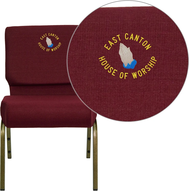 This beautiful church chair will keep your guests comfortable whether you’re hosting an all-day seminar, serving a 10 course meal or delivering your most inspirational sermon. This chair offers an advantage over pew seating with the flexibility of creating different seating configurations.The chair’s cushioned back and 4 inch thick seat are generously padded with CA117 fire retardant foam and covered in durable fabric upholstery. The spacious, 21 inch wide seat has a waterfall edge that reduces pressure on your attendees’ legs. A convenient book pouch on the back of the chair keeps seminar materials, bibles or hymn books readily available. Built-in ganging brackets connect your chairs and maintain nice, straight rows. Its sturdy 16 gauge steel, gold vein frame, with gracefully angled legs, has been tested to hold up to 800 pounds and plastic rocker glides protect your floor by sliding smoothly when you need to move the chair. Personalize it with a name, logo or organization name embroidered on the chair’s back. Select a design from our Digital Library (20,000 Images) or submit your own custom design. Choose from many available fonts and thread colors.This Church Chair is an excellent option for hotel lobbies, banquet halls, conference facilities and worship centers.