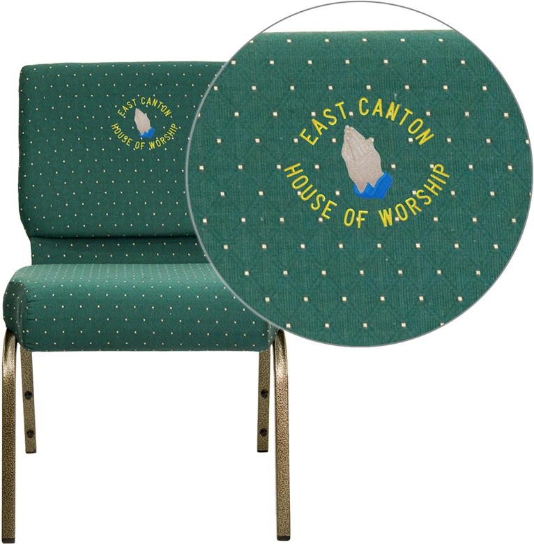 This beautiful church chair will keep your guests comfortable whether you’re hosting an all-day seminar, serving a 10 course meal or delivering your most inspirational sermon. This chair offers an advantage over pew seating with the flexibility of creating different seating configurations.The chair’s cushioned back and 4 inch thick seat are generously padded with CA117 fire retardant foam and covered in durable fabric upholstery. The spacious, 21 inch wide seat has a waterfall edge that reduces pressure on your attendees’ legs. A convenient book pouch on the back of the chair keeps seminar materials, bibles or hymn books readily available. Built-in ganging brackets connect your chairs and maintain nice, straight rows. Its sturdy 16 gauge steel, gold vein frame, with gracefully angled legs, has been tested to hold up to 800 pounds and plastic rocker glides protect your floor by sliding smoothly when you need to move the chair. Personalize it with a name, logo or organization name embroidered on the chair’s back. Select a design from our Digital Library (20,000 Images) or submit your own custom design. Choose from many available fonts and thread colors.This Church Chair is an excellent option for hotel lobbies, banquet halls, conference facilities and worship centers.