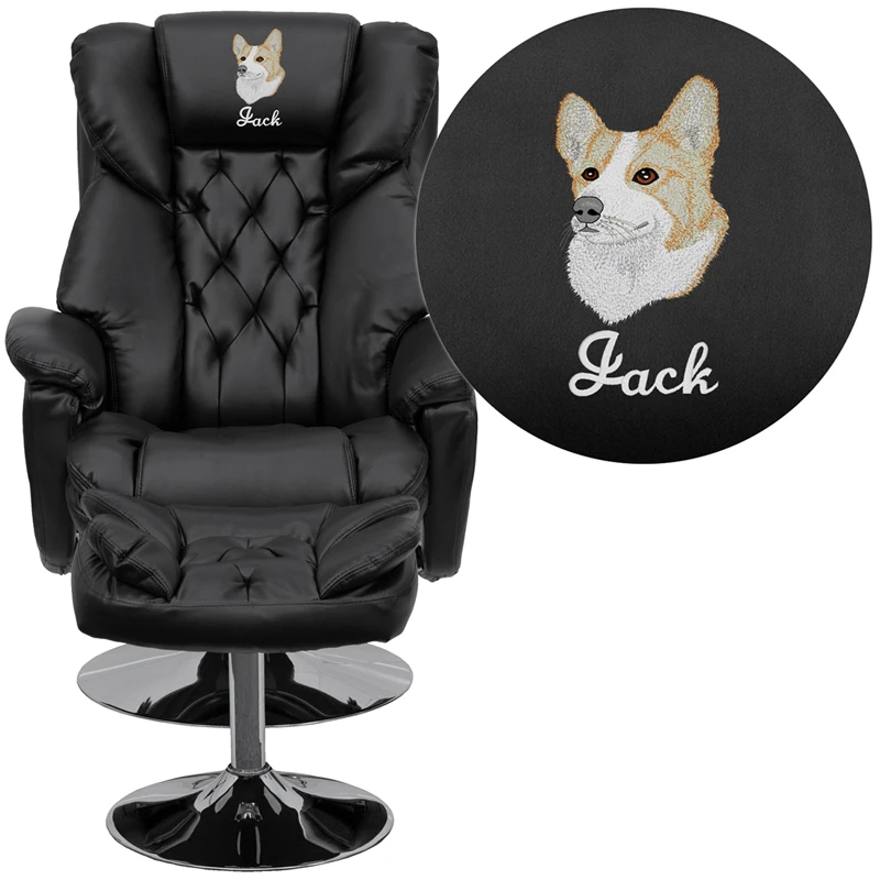 This overstuffed leather recliner will make an excellent choice in your traditional or contemporary home or office setting. This set features super thick padding throughout the chair and ottoman as well as chrome exposed bases that provide a contemporary feel. The durable leather upholstery allows for easy cleaning and regular care. Personalize this chair with custom text or a logo to show off your individual style or company design.