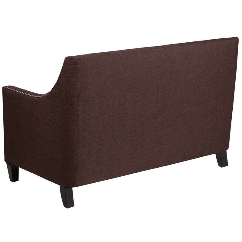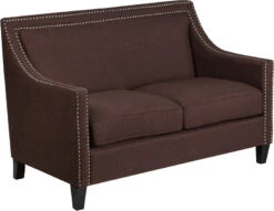 This luxurious transitional loveseat exudes charm with dense foam seating and accented nail trim. The arms curve into a straight design to comfortably rest. Raised wood tapered feet finish off the appeal of this loveseat. Complement your living room, sitting room or office with this versatile piece.