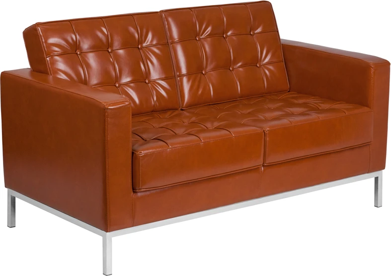 The Cognac Leather Loveseat with Stainless Steel Frame brings comfort and trend-setting style to your waiting room, reception area or home.It features a straight arm design with fixed, button-tufted seat and back cushions, which are filled with 5.5” of CA117 fire retardant foam and upholstered in leather. A stainless steel frame and integrated legs give this loveseat added strength and a distinctive flair. Make a great impression on your clients and customers with this handsome contemporary loveseat.