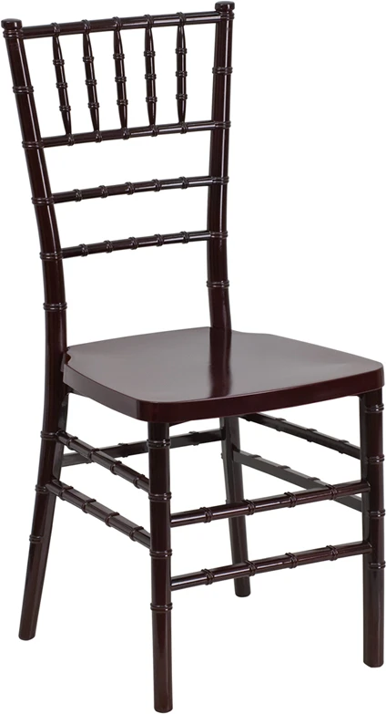 The Mahogany Resin Chiavari Chair is ideal for weddings, banquets and special events from casual to the most elegant. Constructed of ultra-strong resin and polycarbonate, this chair is very lightweight, yet extremely strong and wobble-free. The color of the frame is the same all the way through, so you don’t have to worry about cosmetic nicks and scratches ruining the appearance. It’s UV treated to help prevent fading and discoloration. No re-painting or staining is ever needed; your chairs will look great for years to come. These beautiful chairs ship fully assembled, can be stacked 8 high for storage.With its durable, lightweight construction and elegant styling, this Chiavari chair will be the prime seating choice for all of your special events, whether indoors or outside.