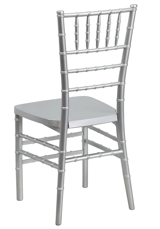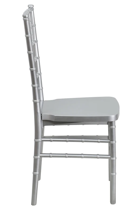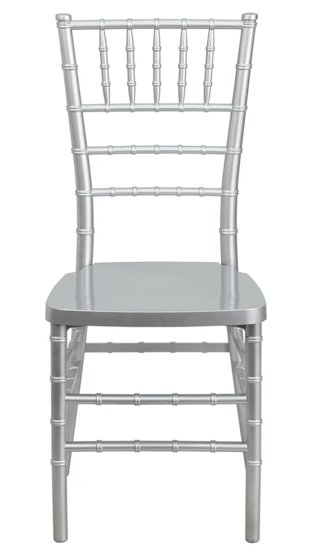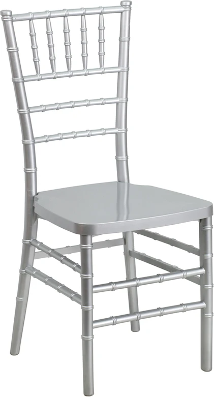 The Silver Resin Chiavari Chair is ideal for weddings, banquets and special events from casual to the most elegant. Constructed of ultra-strong resin and polycarbonate, this chair is very lightweight, yet extremely strong and wobble-free. The color of the frame is the same all the way through, so you don’t have to worry about cosmetic nicks and scratches ruining the appearance. It’s UV treated to help prevent fading and discoloration. No re-painting or staining is ever needed; your chairs will look great for years to come. These beautiful chairs ship fully assembled, can be stacked 8 high for storage.With its durable, lightweight construction and elegant styling, this Chiavari chair will be the prime seating choice for all of your special events, whether indoors or outside.