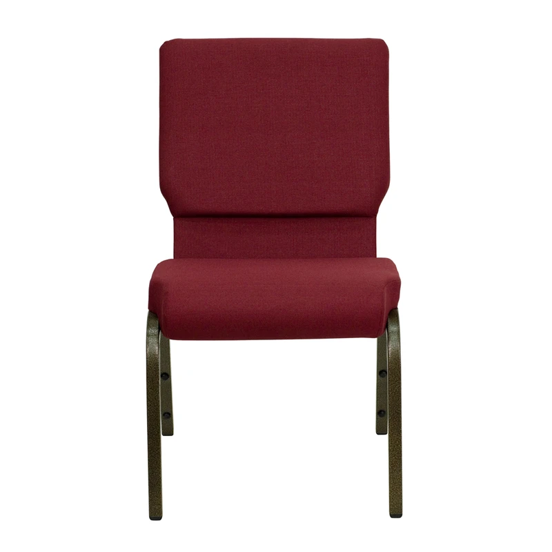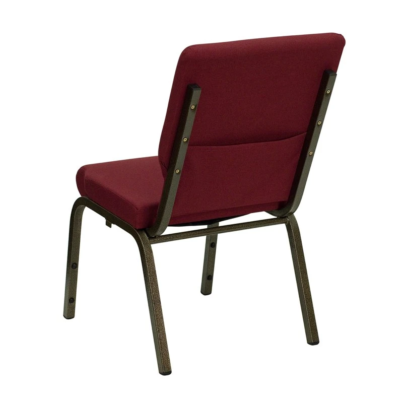 This beautiful church chair will keep your guests comfortable whether you’re hosting an all-day seminar, serving a 10 course meal or delivering your most inspirational sermon. This chair offers an advantage over pew seating with the flexibility of creating different seating configurations.The chair’s cushioned back and 4 inch thick seat are generously padded with CA117 fire retardant foam and covered in durable fabric upholstery. The seat has a waterfall edge that reduces pressure on your attendees’ legs. A convenient book pouch on the back of the chair keeps seminar materials, bibles or hymn books readily available. Built-in ganging brackets connect your chairs and maintain nice, straight rows. Its sturdy 16 gauge steel, gold vein frame, with gracefully angled legs, has been tested to hold up to 800 pounds and plastic rocker glides protect your floor by sliding smoothly when you need to move the chair.This Church Chair is an excellent option for hotel lobbies, banquet halls, conference facilities and worship centers.