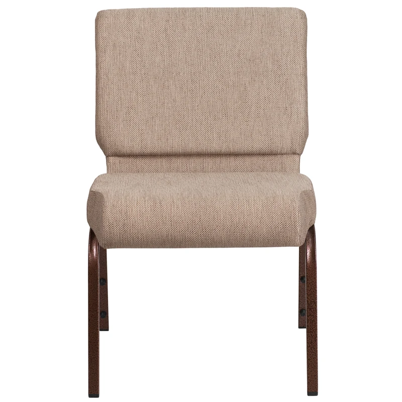 This beautiful church chair will keep your guests comfortable whether you’re hosting an all-day seminar, serving a 10 course meal or delivering your most inspirational sermon. This chair offers an advantage over pew seating with the flexibility of creating different seating configurations.The chair’s cushioned back and 4 inch thick seat are generously padded with CA117 fire retardant foam and covered in durable fabric upholstery. The spacious, 21 inch wide seat has a waterfall edge that reduces pressure on your attendees’ legs. A convenient book pouch on the back of the chair keeps seminar materials, bibles or hymn books readily available. Built-in ganging brackets connect your chairs and maintain nice, straight rows. Its sturdy 16 gauge steel, copper vein frame, with gracefully angled legs, has been tested to hold up to 800 pounds and plastic rocker glides protect your floor by sliding smoothly when you need to move the chair.This Church Chair is an excellent option for hotel lobbies, banquet halls, conference facilities and worship centers.