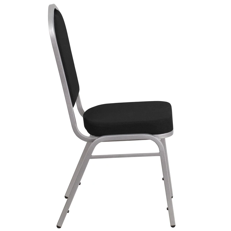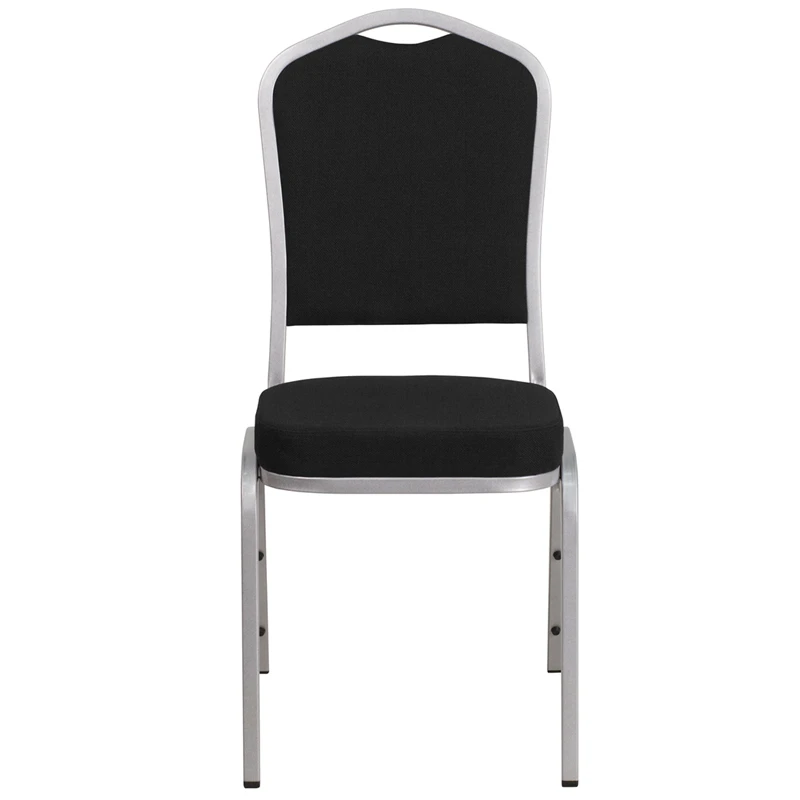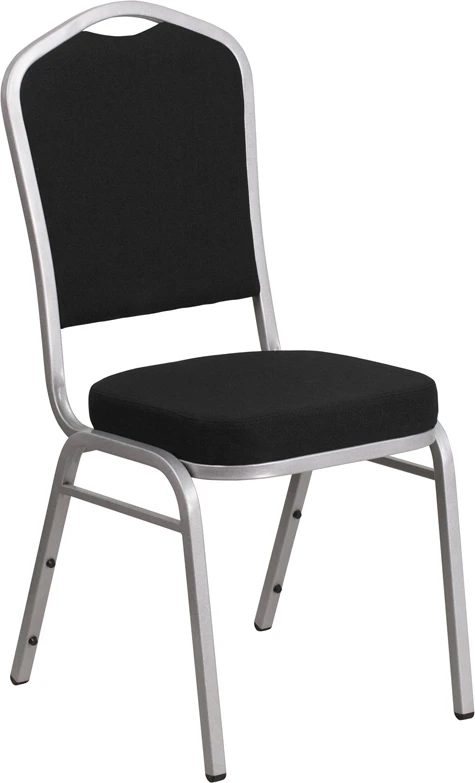 This commercial grade banquet chair with crown back design fits well in formal and casual settings from wedding ceremonies to corporate meetings and awards banquets.The chair’s cushioned back and 2.5 inch thick seat are padded with CA117 fire retardant foam and covered in beautiful fabric upholstery. Its sturdy, 16 gauge steel, powder coated frame, with gracefully angled legs, has been tested to hold up to 500 pounds. Double support braces reinforce the frame to give it great strength and durability. Bumper guards prevent scratches on the frame when stacked (up to 15 high) and non-marring floor glides protect your floor by sliding smoothly when you need to move the chair.This durable Banquet Chair is an excellent option for churches, banquet halls, training rooms, hotels, convention centers and schools.