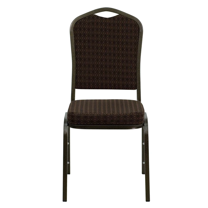 This commercial grade banquet chair with crown back design fits well in formal and casual settings from wedding ceremonies to corporate meetings and awards banquets.The chair’s cushioned back and 2.5 inch thick seat are padded with CA117 fire retardant foam and covered in beautiful fabric upholstery. Its sturdy, 16 gauge steel, powder coated frame, with gracefully angled legs, has been tested to hold up to 500 pounds. Double support braces reinforce the frame to give it great strength and durability. Bumper guards prevent scratches on the frame when stacked (up to 15 high) and non-marring floor glides protect your floor by sliding smoothly when you need to move the chair.This durable Banquet Chair is an excellent option for churches, banquet halls, training rooms, hotels, convention centers and schools.