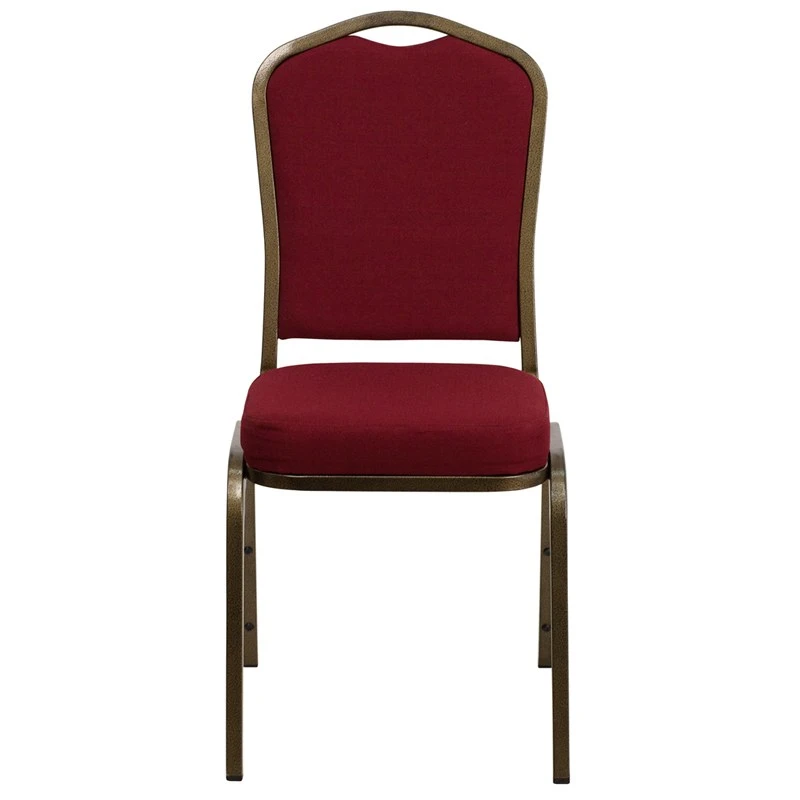 This commercial grade banquet chair with crown back design fits well in formal and casual settings from wedding ceremonies to corporate meetings and awards banquets.The chair’s cushioned back and 2.5 inch thick seat are padded with CA117 fire retardant foam and covered in beautiful fabric upholstery. Its sturdy, 16 gauge steel, powder coated frame, with gracefully angled legs, has been tested to hold up to 500 pounds. Double support braces reinforce the frame to give it great strength and durability. Bumper guards prevent scratches on the frame when stacked (up to 15 high) and non-marring floor glides protect your floor by sliding smoothly when you need to move the chair.This durable Banquet Chair is an excellent option for churches, banquet halls, training rooms, hotels, convention centers and schools.