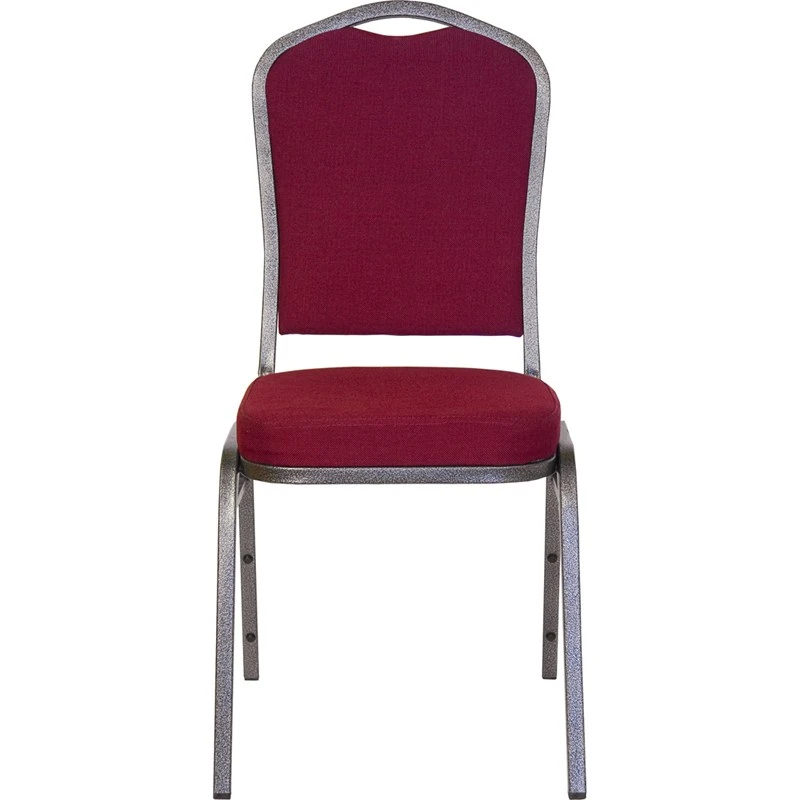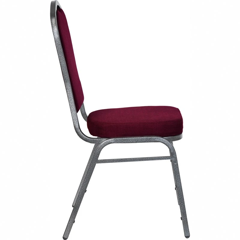 This commercial grade banquet chair with crown back design fits well in formal and casual settings from wedding ceremonies to corporate meetings and awards banquets.The chair’s cushioned back and 2.5 inch thick seat are padded with CA117 fire retardant foam and covered in beautiful fabric upholstery. Its sturdy, 16 gauge steel, powder coated frame, with gracefully angled legs, has been tested to hold up to 500 pounds. Double support braces reinforce the frame to give it great strength and durability. Bumper guards prevent scratches on the frame when stacked (up to 15 high) and non-marring floor glides protect your floor by sliding smoothly when you need to move the chair.This durable Banquet Chair is an excellent option for churches, banquet halls, training rooms, hotels, convention centers and schools.