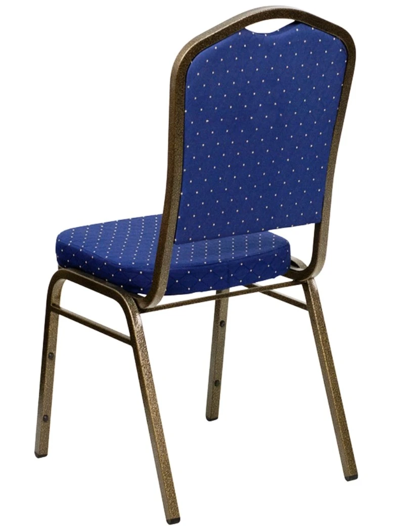 This commercial grade banquet chair with crown back design fits well in formal and casual settings from wedding ceremonies to corporate meetings and awards banquets.The chair’s cushioned back and 2.5 inch thick seat are padded with CA117 fire retardant foam and covered in beautiful fabric upholstery. Its sturdy, 16 gauge steel, powder coated frame, with gracefully angled legs, has been tested to hold up to 500 pounds. Double support braces reinforce the frame to give it great strength and durability. Bumper guards prevent scratches on the frame when stacked (up to 15 high) and non-marring floor glides protect your floor by sliding smoothly when you need to move the chair.This durable Banquet Chair is an excellent option for churches, banquet halls, training rooms, hotels, convention centers and schools.