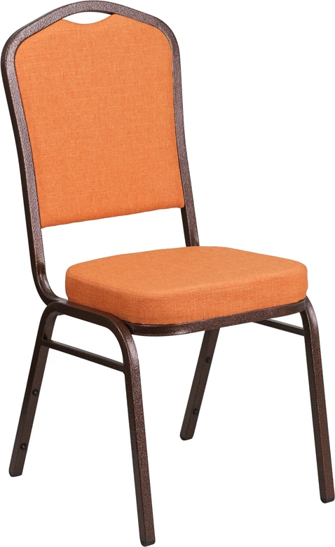 This commercial grade banquet chair with crown back design fits well in formal and casual settings from wedding ceremonies to corporate meetings and awards banquets.The chair’s cushioned back and 2.5 inch thick seat are padded with CA117 fire retardant foam and covered in beautiful fabric upholstery. Its sturdy, 16 gauge steel, powder coated frame, with gracefully angled legs, has been tested to hold up to 500 pounds. Double support braces reinforce the frame to give it great strength and durability. Bumper guards prevent scratches on the frame when stacked (up to 15 high) and non-marring floor glides protect your floor by sliding smoothly when you need to move the chair.This durable Banquet Chair is an excellent option for churches, banquet halls, training rooms, hotels, convention centers and schools.