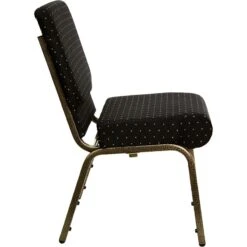 This commercial grade banquet chair with angled back design fits well in formal and casual settings from wedding ceremonies to corporate meetings and awards banquets.The chair’s cushioned back and 1.5 inch thick seat are padded with CA117 fire retardant foam and covered with durable vinyl upholstery. Its 18 gauge steel, silver vein finished frame, with gracefully angled legs, has been tested to hold up to 500 pounds. Double support braces reinforce the frame to give it great strength and durability. Bumper guards prevent scratches on the frame when stacked (up to 15 high) and non-marring floor glides protect your floor by sliding smoothly when you need to move the chair.This durable Banquet Chair is an excellent option for churches, banquet halls, training rooms, hotels, convention centers and schools.