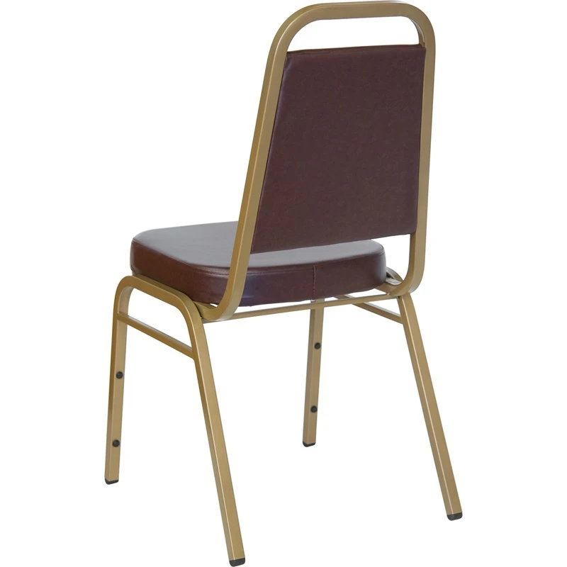 This commercial grade banquet chair with trapezoidal back design fits well in formal and casual settings from wedding ceremonies to corporate meetings and awards banquets.The chair’s cushioned back and 2.5 inch thick seat are padded with CA117 fire retardant foam and covered with durable vinyl upholstery. Its sturdy, 16 gauge steel, powder coated frame, with gracefully angled legs, has been tested to hold up to 500 pounds. Double support braces reinforce the frame to give it great strength and durability. Bumper guards prevent scratches on the frame when stacked (up to 15 high) and non-marring floor glides protect your floor by sliding smoothly when you need to move the chair.This durable Banquet Chair is an excellent option for churches, banquet halls, training rooms, hotels, convention centers and schools.