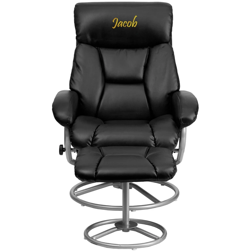 This overstuffed leather recliner will look great in any room in the home or office. This set features plush padding throughout the chair and ottoman as well as exposed metal bases. The durable leather upholstery allows for easy cleaning and regular care. Personalize this chair with custom text to show off your individual style.
