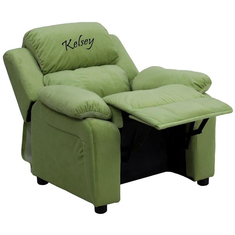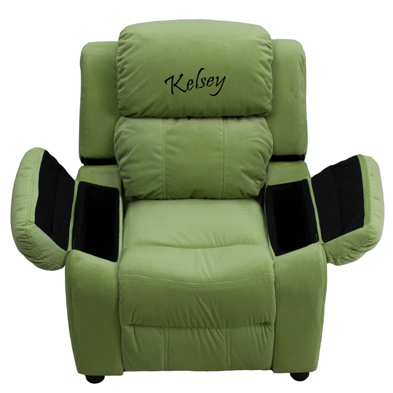 The child-sized recliner with deluxe padding is a perfect spot for kids to watch TV, play video games or read their favorite book.It’s covered with soft and snuggly microfiber upholstery and features flip-up storage arms for remote controls, books and game controllers. This sturdy little recliner has a solid hardwood frame, soft foam padding and durable upholstery that cleans easily with a damp cloth. It has raised black plastic feet, and will hold up to 90 pounds. Designed with safety in mind, it’s filled with CA117 fire retardant foam, and reclines only when a child is seated and the footrest is pulled out one inch.This cozy kids recliner will be a welcome addition to your living room or your child’s bedroom or playroom. You can even personalizeit with your child’s name, nickname or other text embroidered on the headrest cover. Choose from many available fonts and thread colors.