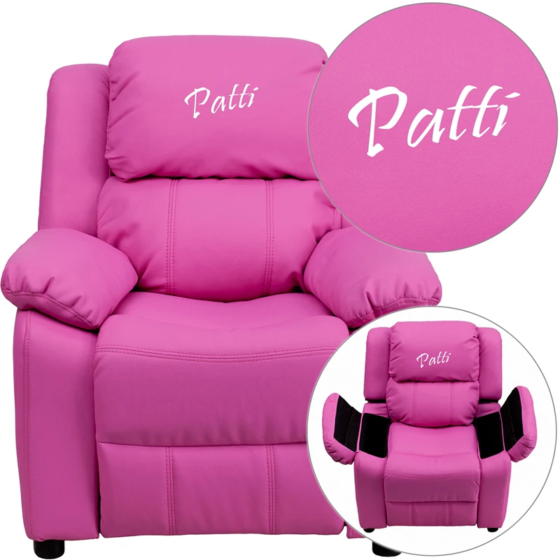 The child-sized recliner with deluxe padding is a perfect spot for kids to watch TV, play video games or read their favorite book.The chair features plush padding, vinyl upholstery and flip-up storage arms for remote controls, books and game controllers. This sturdy little recliner has a solid hardwood frame and durable upholstery that cleans easily with a damp cloth. It has raised black plastic feet and will hold up to 90 pounds. Designed with safety in mind, it’s filled with CA117 Fire retardant foam, and reclines only when a child is seated and the footrest is pulled out one inch.This cozy kids recliner will be a great addition to your living You can even personalize it with your child’s name, nickname or other text embroidered on the headrest.