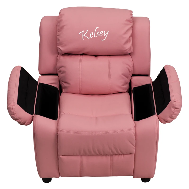 The child-sized recliner with deluxe padding is a perfect spot for kids to watch TV, play video games or read their favorite book.The chair features plush padding, vinyl upholstery and flip-up storage arms for remote controls, books and game controllers. This sturdy little recliner has a solid hardwood frame and durable upholstery that cleans easily with a damp cloth. It has raised black plastic feet and will hold up to 90 pounds. Designed with safety in mind, it’s filled with CA117 Fire retardant foam, and reclines only when a child is seated and the footrest is pulled out one inch.This cozy kids recliner will be a great addition to your living room or your child’s bedroom or playroom. You can even personalize it with your child’s name, nickname or other text embroidered on the headrest cover. Choose from many available fonts and thread colors.