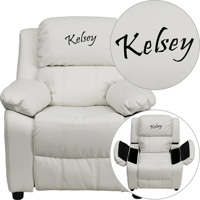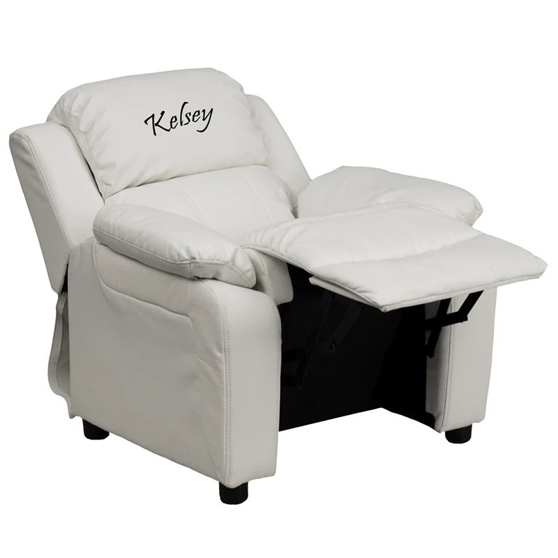 The child-sized recliner with deluxe padding is a perfect spot for kids to watch TV, play video games or read their favorite book.The chair features plush padding, vinyl upholstery and flip-up storage arms for remote controls, books and game controllers. This sturdy little recliner has a solid hardwood frame and durable upholstery that cleans easily with a damp cloth. It has raised black plastic feet and will hold up to 90 pounds. Designed with safety in mind, it’s filled with CA117 Fire retardant foam, and reclines only when a child is seated and the footrest is pulled out one inch.This cozy kids recliner will be a great addition to your living room or your child’s bedroom or playroom. You can even personalize it with your child’s name, nickname or other text embroidered on the headrest cover. Choose from many available fonts and thread colors.