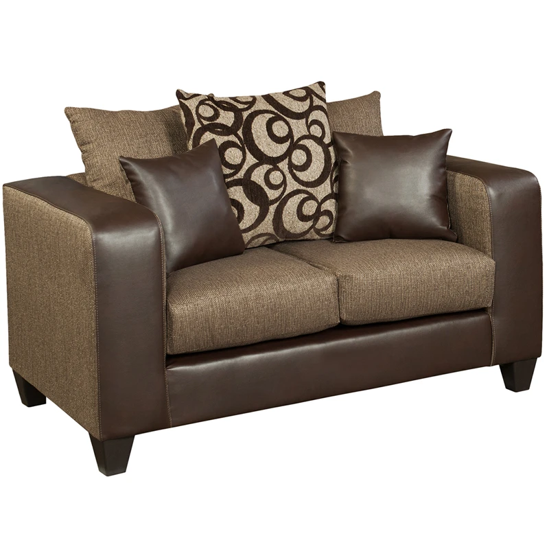 This contemporary loveseat features soft chenille upholstery and decorative toss pillows that adds comfort. The brown tones arranged throughout this collection will add warmth to your home. This furniture is set apart with the use of two different upholstery types to make up the frame and seating area. The modern design of this collection is sure to awaken the decor in your living room or sitting room.