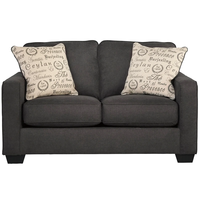 Merging a decidedly clean profile with cozy comfort, this loveseat is high style made for real living. Neatly tailored box cushions and crisp, track arms beautifully enhance the aesthetic, while a fresh hued microfiber upholstery simply works. Pair of script pillows are a posh touch.