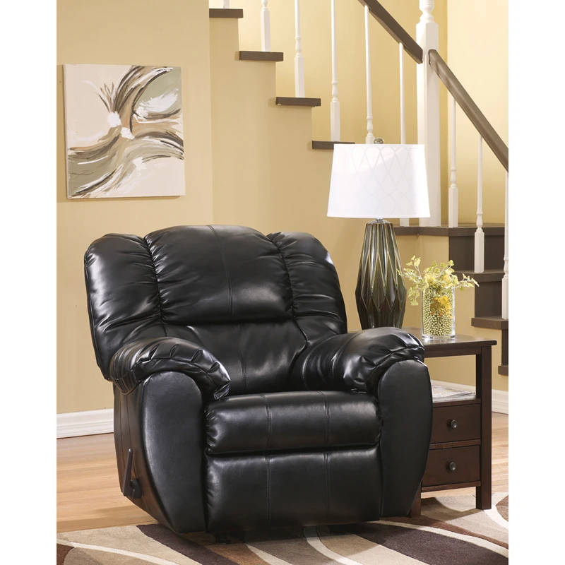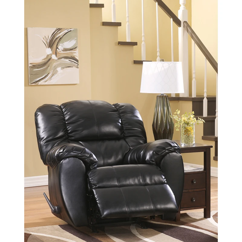 You love the classic look of weatherworn leather, but you want a whole lot more comfort than a standard arm chair can offer. Rest assured, this rocker recliner, a high-quality faux leather option, gives you the best of all worlds. Curved, contemporary lines and stylish stitching details make quite a fashion statement. Plush padded arms, thick bustle-back cushion support are an irresistibly comfortable combination.