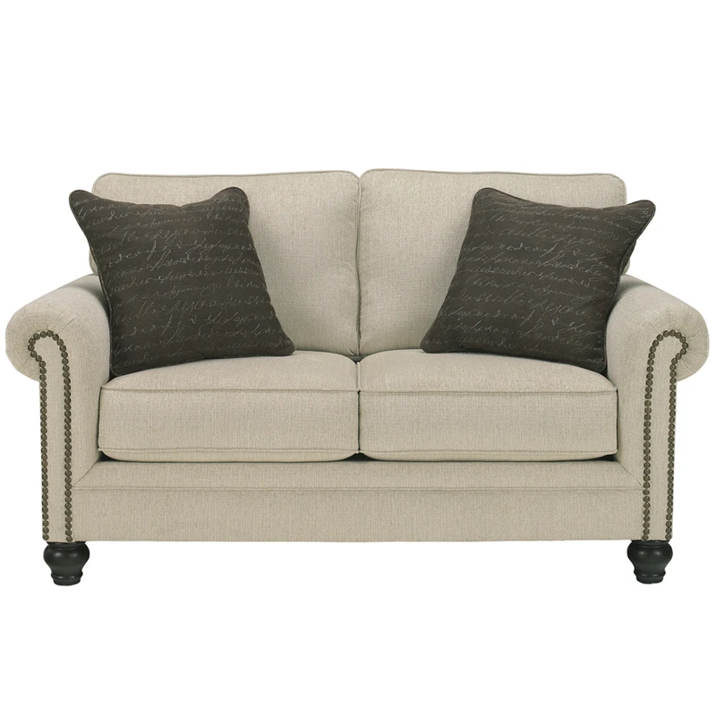 This loveseat masters the art of smart and sophisticated style. Linen-like upholstery exudes such a crisp, clean sensibility, while nailhead trim really plays up the flow and flair of rolled arms. Turned bun feet in a rich, dark finish are a brilliant complement.