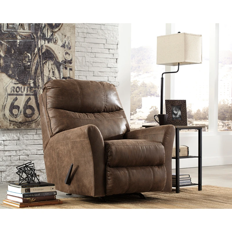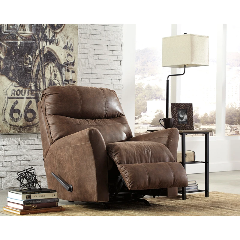 Why wait years to achieve the look of perfectly broken-in leather when instant gratification awaits with this rocker recliner. Winning over fans with its crisp, tailored lines, sporty baseball stitching and an ultra-clever faux leather. This stylishly crafted recliner delights with plush comfort and an effortless sense of style.